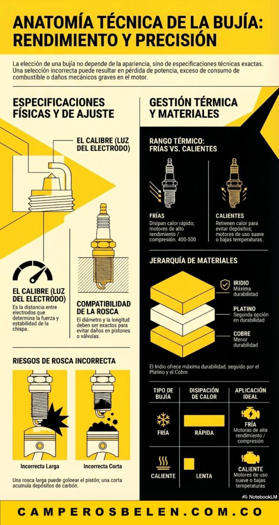 Las bujías son mucho más que un simple componente reemplazable: son piezas de precisión diseñadas para trabajar en condiciones específicas. El calibre, la rosca y el rango térmico son factores determinantes que no deben pasarse por alto.